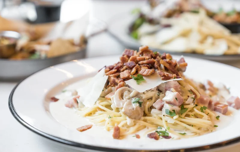 Чуть хрустящие кусочки бекона, шампиньоны и сливочный соус с чесноком и петрушкой — с такой компанией макаронные изделия, например лингвини, получатся просто изумительными на вкус. Блюдо насыщенное, но не тяжёлое, соус придаёт нежный сливочный вкус, а бекон — приятный аромат копчёностей.