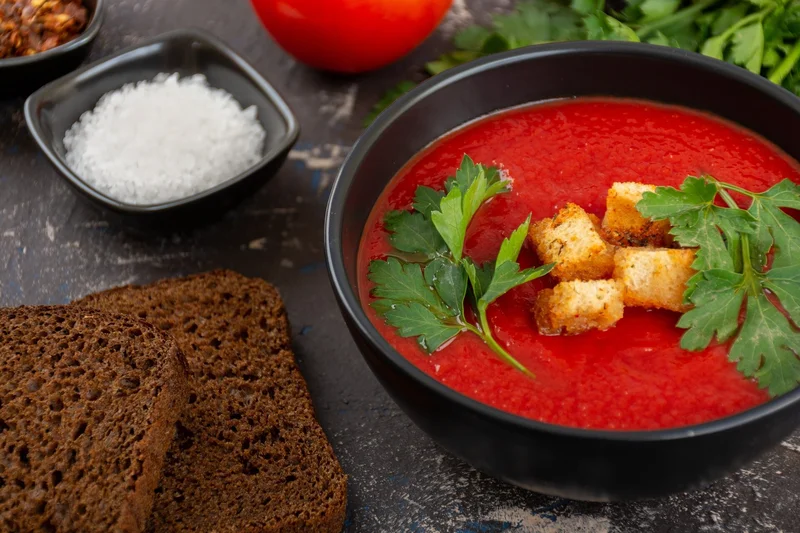 4. Готовый томатный суп-пюре с рисом солим и перчим.