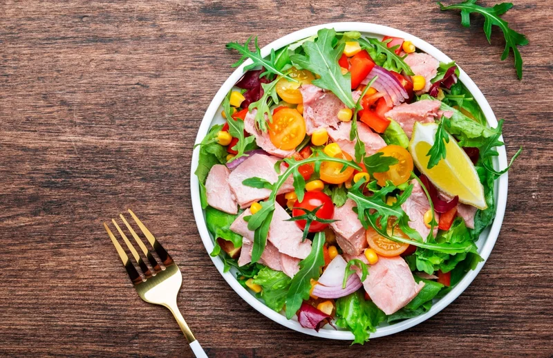 Если близится дело к обеду или у вас намечается праздник, приготовьте сытный салат с сухариками, ветчиной и кукурузой.