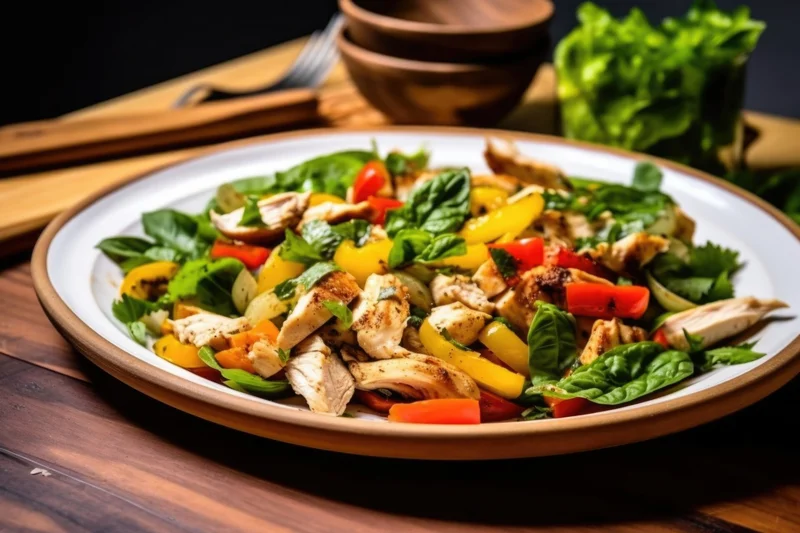 5. Теплый салат с курицей и сладким перцем готов. Подавайте к столу немедленно.