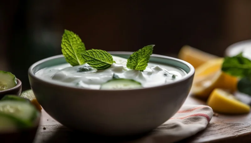 Легкая освежающая райта с огурцами и мятой! Идеальное дополнение к жареным и печеным блюдам!