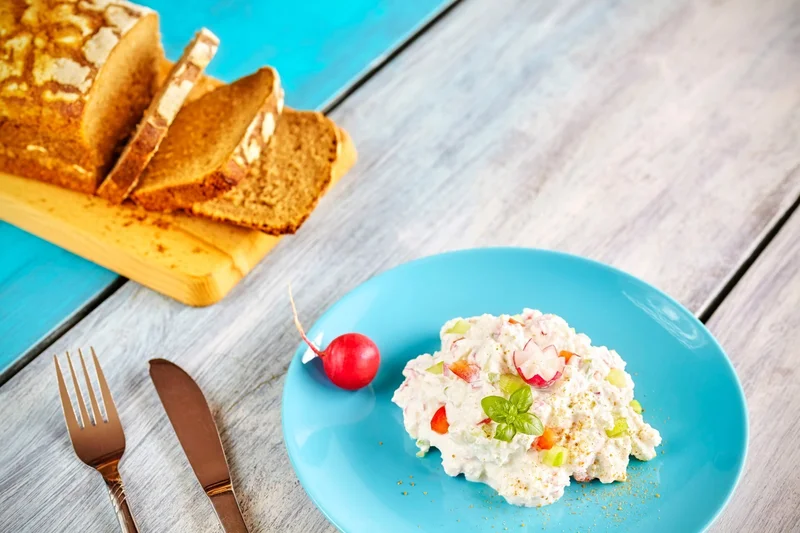 3. Крабовые палочки нарезать небольшими кусочками, подготовить творог.