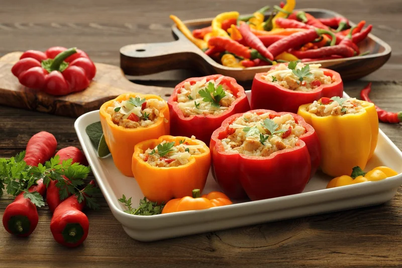 6. Перец разрезать вдоль на две части, нафаршировать рисом с овощами, выложить в форму для запекания. На дно формы налить немного овощного бульона или воды, посолить и поперчить.