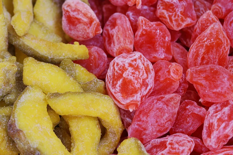 Еще один старинный способ консервирования плодов — производство сухого варенья, или цукатов. Для этого фрукты и ягоды проходят многоступенчатый процесс варки в сахарном сиропе, в ходе которого они пропитываются им, но при этом не теряют своей формы и плотности. Затем заготовки высушиваются в духовке или специальном дегидраторе. Интересно, что сухое варенье было особенно любимо императрицей Екатериной II.