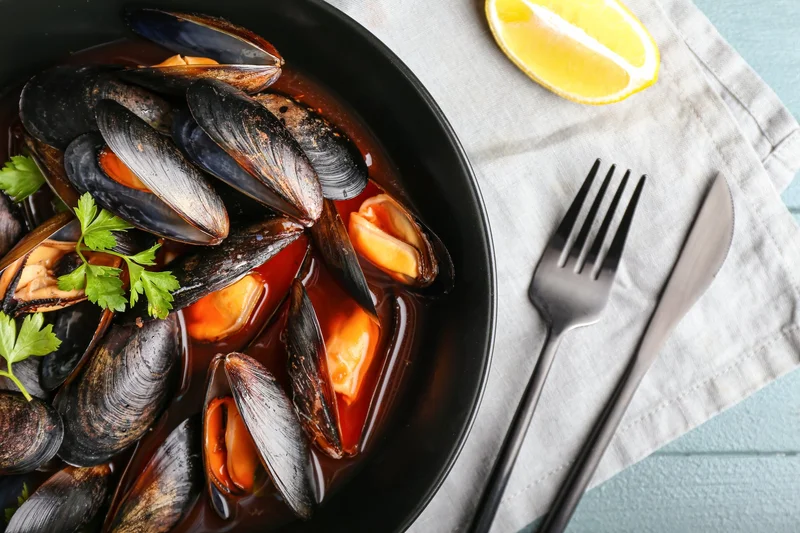Мидии с помидорами и чесноком
